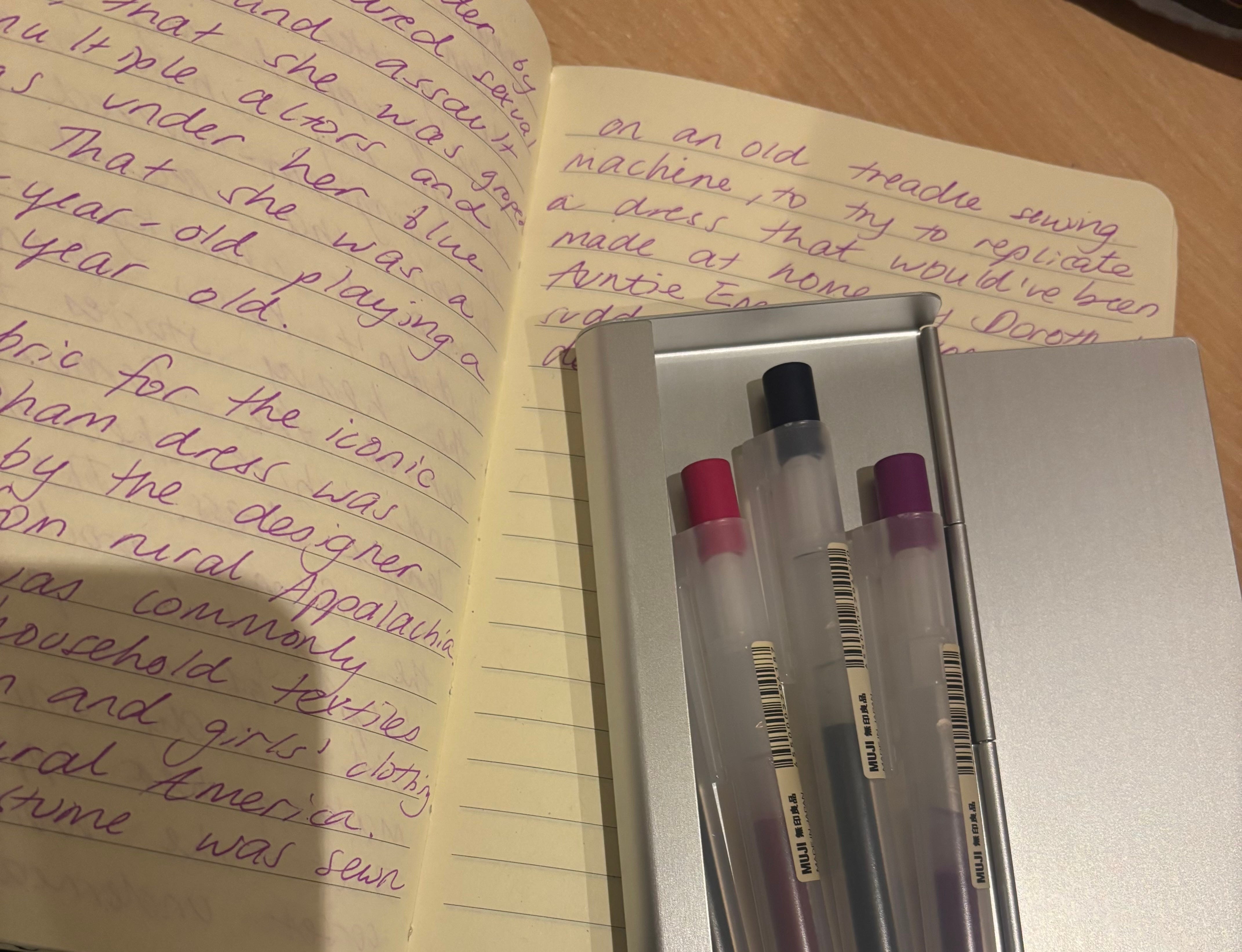 I have been writing by hand in the library, a relatively new development for me. I take notes by hand, but I don’t write by hand that much – until I went and bought myself three new Muji pens and a Muji aluminium pencil case to put them in. It clicks shut in a satisfying way. I got the inky pens that come in lots of colours. Ever since, I’ve been making more notes and writing more chunks of my book in my red project notebook. I had been feeling stuck, and I think these pens might have gifted me an actual creative breakthrough. I normally have trouble sustaining enough focus to write by hand at home, so I take my notebook out with me and do my best writing-by-hand whenever I’m out of the house. I do it in short chunks of time, 10 minutes or 15 minutes. I set a timer on my phone and force myself to go, like I’m in a writing workshop and someone’s watching the clock. I had forgotten how it helps me think. A friend of mine said: “Isn’t it slow?” Yes, it is slow. The words come slower but the ideas – and connections between them – come faster.